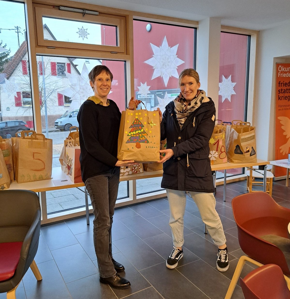 Die Idee: jeden Tag etwas schenken, statt selbst ein Türchen zu öffnen! Zu diesem Zweck wurden 24 nummerierte leere Tüten aufgestellt.