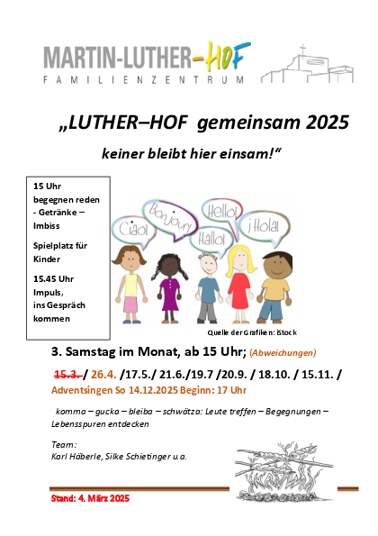 So lautet die Einladung in den Martin-Luther-Hof jeden dritten Samstagnachmittag im Monat. Jung und Alt aus der Gemeinde und aus dem Quartier, Familien der Afrokids und aus der Kita. Begegnung und Gespräche bei Kaffee und Gebäck im sonnigen Foyer des Martin-Luther-Hofs. Die Kinder spielen auf dem Spielplatz im Innenhof oder im Melanchthonsaal. Zum Ausklang zusammenstehen und reden rund um die Feuerschale mit Stockbrot.