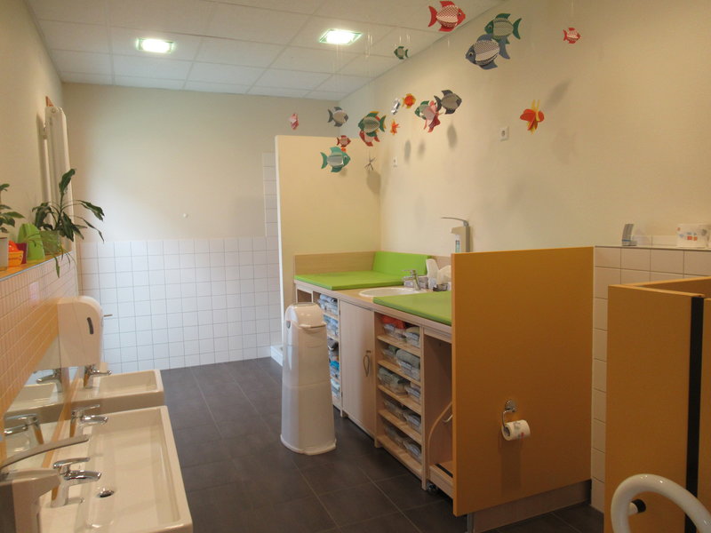 Der Sanitärbereich ist altersgerecht ausgestattet und kann von den Kindern mit den pädagogischen Fachkräften zusammen zum experimentieren und spielen mit Wasser genutzt werden. Es gibt eine doppelte Wickelstation, eine Toilette mit und eine ohne Kabine, für U3 und Ü3 Kinder.
