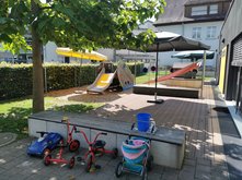 Im Freien teilen sich jeweils zwei Gruppen einen großen Sandkasten und Spielgeräte. Sie regen die Kinder zu vielfältigen motorischen Aktivitäten an. Durch die unterschiedlichen Bodenstrukturen, wie Wiese, Erde, Rindenmulch, Sand, Naturmaterialien werden die Sinne der Kinder angeregt und differenzierte taktile Erfahrungen ermöglicht.