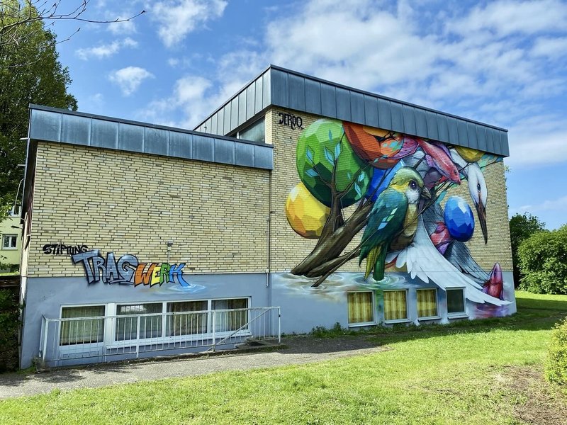 Im Rahmen des Projekts "gemeinsam stark" haben am 13.04. und 14.04.2024 unsere Jugendlichen gemeinsam mit dem Künstler Christoph „JEROO“ Ganter ein beeindruckendes Graffiti-Kunstwerk an der Turnhallenwand auf unserem Schulgelände in Kirchheim unter Teck geschaffen.