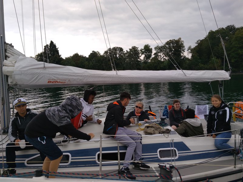 7 junge Menschen aus 5 verschiedenen Ländern und Wohngruppen, im Alter zwischen 11 und 19 Jahren sowie zwei Mitarbeiter der Stiftung Tragwerk haben sich am Donnerstag den 05.09.2019 aufgemacht, um ein großes Abenteuer zu erleben. Es ging ab in den Süden, ans schwäbische Meer. Die zwei Fahrzeuge der Stiftung Tragwerk waren mit vielen Taschen und Schlafsäcken der Reisenden beladen. Auf der Fahrt war die Stimmung gut und nach dem obligatorischen Brezel-Vesper und dem ein oder anderen Schokoriegel kamen wir voller Vorfreude um die Mittagszeit am Ultramarin-Hafen in Kressbronn an. Dort wurden wir schon von den ehrenamtlichen Skippern der SG Stern Sindelfingen, der Sportgemeinschaft am Standort des Werks Sindelfingen des Daimler-Konzerns herzlich empfangen.