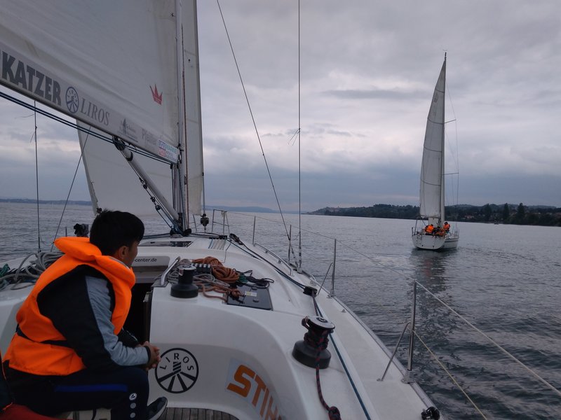 Am nächsten Morgen stachen wir, ohne Regen, schon früh in die hohe See und vergnügten uns beim Baden und natürlich beim Segeln. Aber auch Segelknoten und Segelkommandos lernten wir an Bord kennen. Wer es sich zutraute, durfte auch unter Aufsicht das Boot steuern. Dies stellte sich während des Segelns als gar nicht so leicht heraus, da man die Segel immer in die richtige Position zum Wind stellen musste. Wenn man „hoch am Wind“ segelte, der Wind also leicht schräg von vorne kam, konnte man viele „Knoten“ fahren und war sehr schnell mal kurz in der Schweiz drüben.