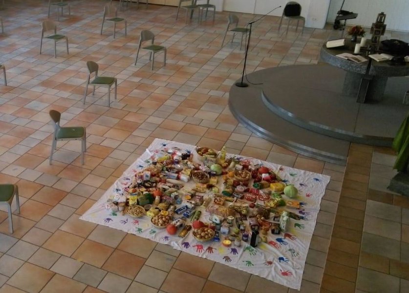 Nun war der Tag gekommen, wo es endlich an die Umsetzung ging. In Vorbereitung auf die Gestaltungsaktion wurden vier Tücher zu zwei großen usammengenäht und umrandet mit den farbigen Handabdrücken der Kinder. Jetzt lagen die Tücher da. Alle mitgebrachten Erntedankgaben der Eltern und einige aus der Gemeinde warteten nur noch auf das Verteilen auf dem Boden. Jeweils ein Viertel des Tuches wurde von einer der vier Kleingruppen gestaltet. Die Begeisterung war groß. Einige Kinder waren schon zu Hause aufgeregt und voller Vorfreude auf diese Aktion, wie mir Eltern zum Gottesdienst mitteilten. Auf die Frage: „Wer von euch weiß denn, wie das Fest heißt, was wir am Sonntag feiern?“, wurde stolz erzählt „Das haben meine Eltern mir mitgegeben.“, oder es war ein aufgeregtes Schweigen. In einer Gruppe meldete sich ein Mädchen und sagte ganz souverän „Das ist das Danke-Ernte-Fest.“ Und ich finde sie hat Recht. Denn das Danke-Ernte-Fest bringt es auf den Punkt. Wir dürfen an erster Stelle dankbar sein. Dankbar für so vieles. An dem Sonntag zum Erntedankfest besonders für die Ernte und die Dinge die wir für unsere Versorgung brauchen. Aber viel mehr dürfen wir noch dankbar sein für unsere Kinder, Eltern, Großeltern, Freunde ebenso für den Frieden in unserem Land, die tollen Spielsachen und für die Umarmungen und jedes tröstende Wort. Das „Danke-Ernte-Fest“ umschließt das Notwendige und nicht Selbstverständliche mit einem „Danke – Fest“.