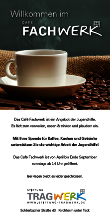 Seit Juni 2015 betreibt die Stiftung Tragwerk ein Café für interessierte Menschen. Der Standort des Cafés kann idealer nicht sein, um sich zu begegnen, miteinander ins Gespräch zu kommen, inne zu halten und Kontakte zu pflegen. An diesem Ort kreuzen die Wege zum und aus dem Altenhilfezentrum Wächterheim, zur Kindertagesstätte TOPKIDS und zum Garten der Begegnung. Pflegeheimbewohner und deren Kinder und Enkel, Kinder der Kindertagesstätte und deren Eltern sowie Besucher des Gartens treffen hier aufeinander. Von Mitte April bis Ende September gibt es die Möglichkeit, Kaffee, Getränke und Kuchen zu kaufen und die Atmosphäre zu genießen. Die Bewirtung im Café Fachwerk erfolgt durch ehrenamtliche Helferinnen und Helfer.